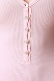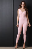 This casual jumpsuit features a ribbed knit fabrication, button up style, v-neckline, and sleeveless fit. Finished with a taper cut legs. Accessories sold separately. Made in U.S.A. 95% Rayon, 5% Spandex.