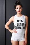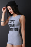 This romper features a jersey knit fabrication, "Let's Get In Formation" graphic print in front, round neckline, and sleeveless construction. Finished with an exposed rear zip-up closure. 95% Cotton, 5% Spandex.