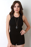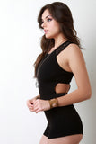 This chic romper features a textured knit fabrication, round neckline, lace shoulder to back design, and back cutouts. Finished with an exposed rear zipper fastener. Accessories sold separately. Made in U.S.A. 96% Polyester, 4% Spandex.