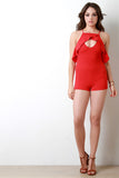 This stylish romper features a textured knit fabrication, halter neckline, front keyhole, and ruffled front to back design. Finished with an exposed rear zipper fastener. Accessories sold separately. Made in U.S.A. 96% Polyester, 4% Spandex.