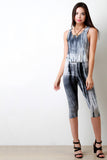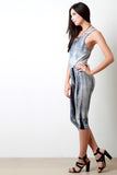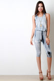This casual jumpsuit features a jersey knit fabrication, tie dye print design, scoop neckline, and crisscross back detail. Finished with a cinched elasticized waist and knee-length hemline. Accessories sold separately. Made in U.S.A. 96% Rayon, 4% Spandex.