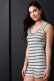 This simple romper features a ribbed knit fabrication with multi-patterned stripes, scoop neckline and back, and sleeveless construction. Accessories sold separately. Made in U.S.A. 95% Rayon, 5% Spandex.
