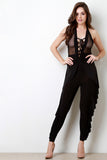 This extravagant jumpsuit features a soft stretchy knit fabrication with constrasting mesh bustier, halter neckline with front lace-up closure, open back, and ruffle-detailed bottom. Finished with taper cut fit. Accessories sold separately. Made in U.S.A. 92% Polyester, 8% Spandex.
