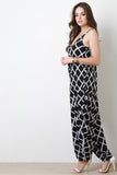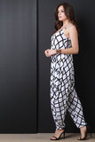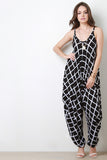 This jumpsuit features soft jersey knit, grid pattern, scoop neckline, spaghetti straps, and harem style pants. Accessories sold separately. Made in USA. 95% Rayon, 5% Spandex.