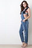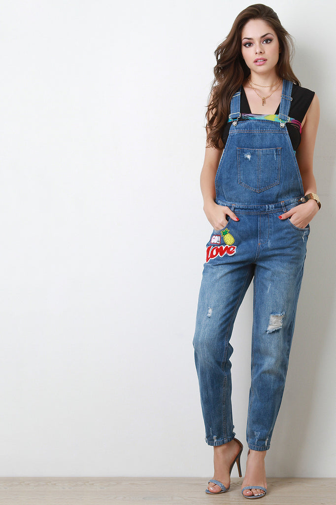 These overalls feature distressed faded denim, adjustable shoulder straps, five pockets, five belt loops, and assorted patches. Accessories sold separately. 100% Cotton.