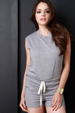 This romper features a French Terry cloth, round neckline, wide shoulder, sleeveless fit, and two front zipper pockets. Finished with an elasticized waist with self-tie lace detail and rear zipper fastener. Accessories sold separately. Made in U.S.A. 87% Polyester, 9% Rayon, 4% Spandex.