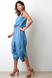 This stylish jumpsuit features a chambray fabrication, scoop neckline with front zip-up closure, sleeveless fit, and baggy capri-length bottom. Finished with an elasticized drawstring waist band and two side pockets. Accessories sold separately. 100% Cotton.