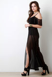 This beautiful jumpsuit features a cold shoulder neckline with two thin straps, contrasting mesh sleeves and open front leg pants, and boxer brief bottom underlay. Accessories sold separately. Made in U.S.A. 65% Polyester, 35% Rayon.