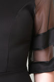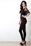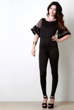 This trendy jumpsuit features a scuba knit fabrication with constrasting short mesh bell sleeves, and button hook closure at nape with keyhole detail. Finished with taper cut legs. Accessories sold separately. Made in U.S.A. 95% Polyester, 5% Spandex.