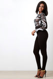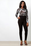 This stylish jumpsuit features a contrasting printed mesh top, solid taper cut bottom, round neckline, and longsleeves construction. Finished with a rear zip-up closure. Accessories sold separately. Made in U.S.A. 95% Rayon, 5% Spandex.