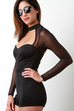 This trendy romper features a sweetheart bustier, choker banded neckline, open back with button hook closure at nape, and mesh longsleeves construction. Stretchy knit fabric and rear zipper fastener. Accessories sold separately. Made in U.S.A. 96% Polyester, 4% Spandex.