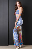 This scene-stealing jumpsuit features smooth stretch fabric, colorful baroque print, deep v-neckline, self-tie halter straps, cutout design, and flared bottoms. Accessories sold separately. Made in USA. 95% Polyester, 5% Spandex.