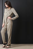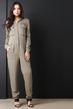 This relax fit jumpsuit features button-up front, patches, four pockets, belt loops, and zipper fly with hook closure. 80% Rayon, 20% Cotton.