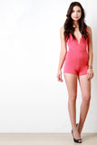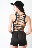 This eye-catching romper features a caged strappy back construction, wired inset deep v-neckline, banded shoulder straps, and back bottom zip-up closure. Accessories sold separately. Made in U.S.A. 96% Polyester, 4% Spandex.