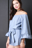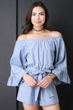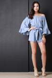 This romper features chambray fabric, elasticized off the shoulder neckline, wide ruffled sleeves, and self-tie belt. Accessories sold separately. Made in USA. 100% Cotton.