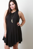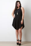 A plus size sleeveless romper featuring smooth fabric, form-flattering princess seams, and pleated skirt with an asymmetrical hemline. Finished with a button closure at the nape, window open back, and zipper closure. Accessories sold separately. Self: 92% Polyester, 8% Spandex. Lining: 100% Polyester.