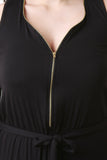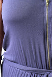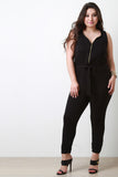 This plus size jumpsuit features an adjustable zipper v-neckline, sleeveless design, elasticized cinched waist with a removable sash, and taper cut leg with ruched accent. Accessories sold separately. Made in U.S.A. 97% Viscose, 3% Spandex.