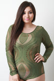 This plus size bodysuit features a mesh lace fabrication with oval patterns, long sleeve fit, and scoop neckline. Finished with a double snap button at crotch. Accessories sold separately. Made in U.S.A. 97% Nylon, 3% Spandex.