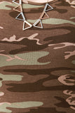 This jumpsuit features a jersey knit fabrication with camo print design, scoop neckline with spaghetti straps, and sleeveless fit. Finished with taper cut legs. Accessories sold separately. Made in U.S.A. 95% Cotton, 5% Spandex.