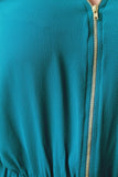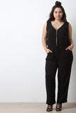 This plus size jumpsuit features an adjustable zipper v-neckline, sleeveless design, elasticized cinched waist with a tie center, slanted pockets, and taper cut leg. Accessories sold separately. Made in U.S.A. 100% Polyester.