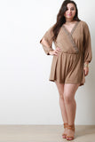 This plus size romper features a smooth stretchy knit fabrication, embellished surplice wrap v-neckline, and longsleeves with cutouts and elasticized cuffs. Finished with an elasticized waist and high waisted fit. Accessories sold separately. 100% Polyester.