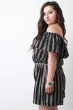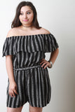 This plus size relaxed-fit striped print fabrication, elasticized off the shoulder neckline with ruffled detail, and short sleeve construction. Finished with a cinched waistline and short bottom half. Accessories sold separately. 100% Rayon.