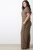 This plus size jumpsuit features a woven knit fabrication with two-tone chevron print, surplice wrap neckline with single button snap closure, and short sleeves fit. Finished with an elasticized waist, and wide leg fit.