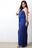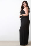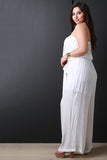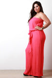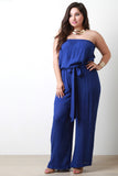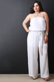 This chic plus size jumpsuit features a strapless elastic neckline, lightweight gauzy fabrication, elastic waist, wide cut leg, half lining, and a removable self tie belt. Accessories sold separately. 100% Polyester.