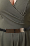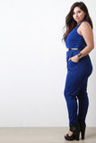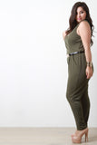 This plus size jumpsuit features a sleeveless design, knit fabrication, surplice v neckline, princess seams, pleated details, front hip pockets, back key hole with button closure at nape, finished with tapered cut legs. Belt included other accessories sold separately. 96% Polyester, 4% Spandex.