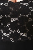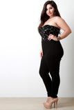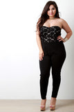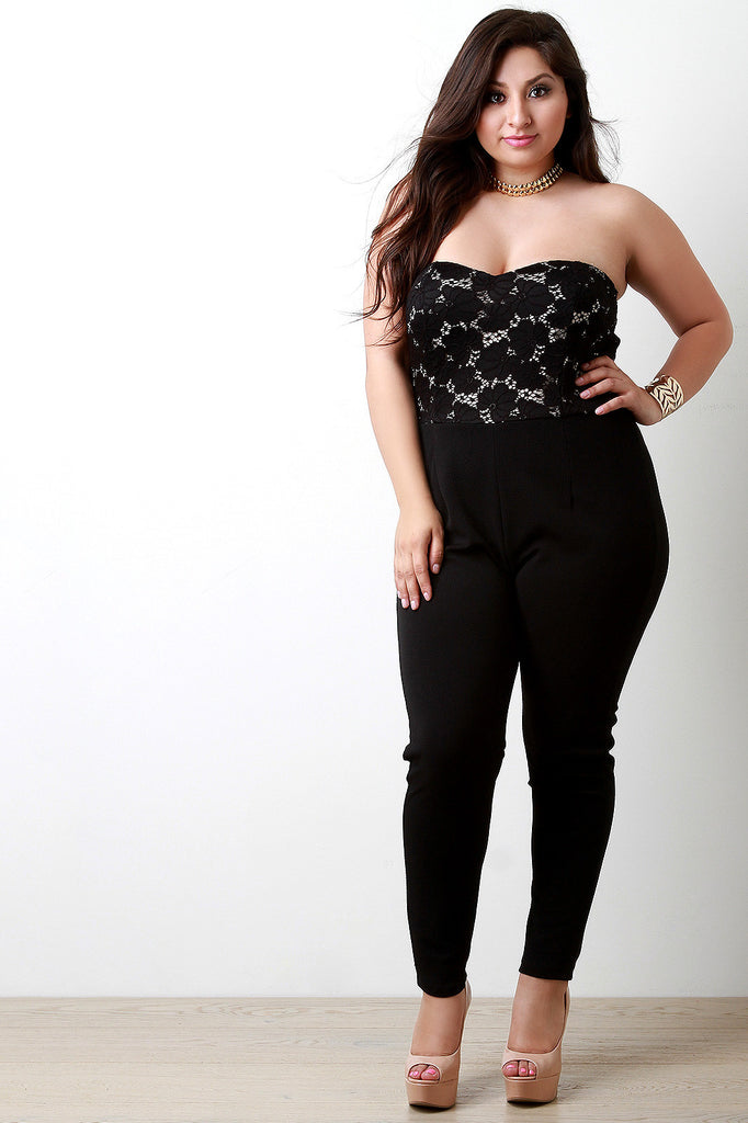 This plus size jumpsuit features a floral lace tube top with contrasting solid textured bottom, stretchy knit under lining, and sweetheart neckline. Finished with taper cut leggings. Accessories sold separately. Made in U.S.A. Self: 96% Polyester, 4% Spandex. Contrast: 92% Nylon, 8% Spandex.