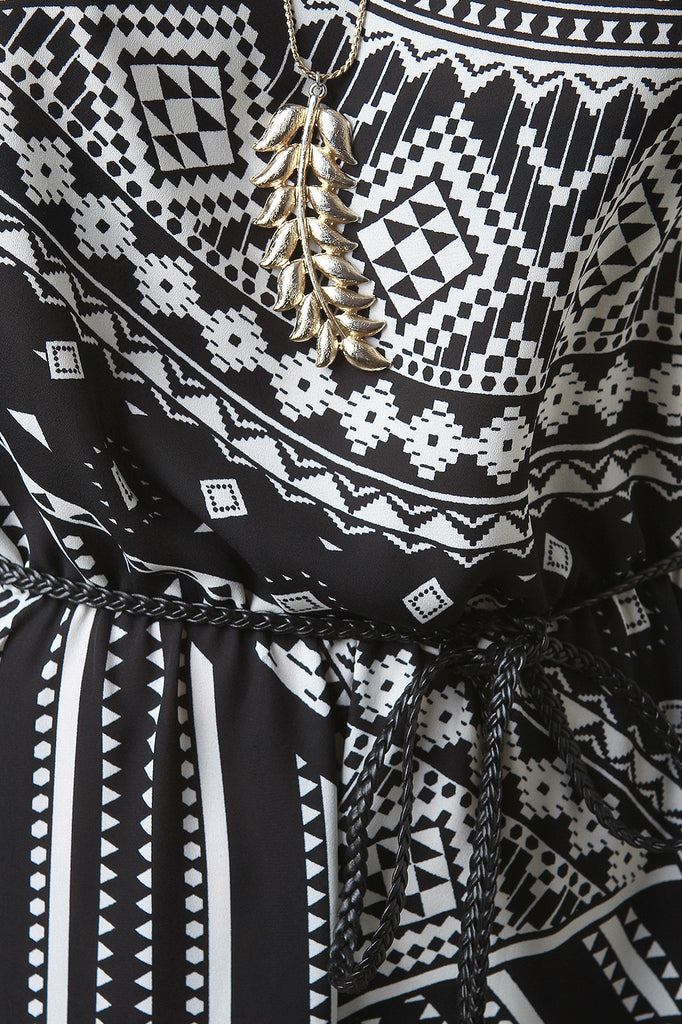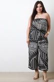 This chic plus size jumpsuit features a strapless elastic neckline, lightweight woven fabrication, abstract tribal inspired print, elastic waist, front hip pockets, wide cut cropped legs and a braided vegan leather tie belt. Accessories sold separately. 100% Polyester.