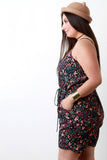This plus size romper features a lightweight knit fabrication, floral print pattern, spaghetti straps, and button up front. Finished with a cinched elasticized waist with self-tie drawstring and two front pockets. Accessories sold separately. Made in U.S.A. 100% Polyester.