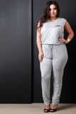 This plus size jumpsuit features a French Terry cloth, round neckline, front angled zipper, knee slit openings, sleeveless construction, and elasticized waist with self-tie drawstrings. Finished with an exposed rear zip-up closure. Accessories sold separately. Made in U.S.A. 87% Polyester, 9% Rayon, 4% Spandex.