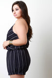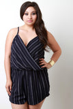 This plus size romper features a textured woven fabric, striped print pattern, surplice neckline with button hook closure, and thin shoulder straps. Finished with a cinched elasticized waist. Accessories sold separately. Made in U.S.A. 100% Polyester.