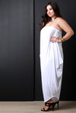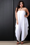 This casually chic jumpsuit features a jersey knit fabrication in a loose draping style, off the shoulder tube neckline, and oversized relaxing fit. Accessories sold separately. Made in U.S.A. 95% Rayon, 5% Spandex.