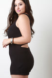 This plus size romper is curve hugging with a stretchy soft knit ribbed design. Scooped necklines and sleeveless bodice. Unlined. Finished with a back slit across the waist area with an elastic band. Accessories sold separately. 48% Polyester. 48% Cotton. 4% Spandex.