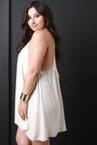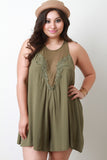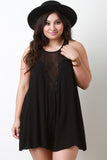 This plus size romper features a high round neckline, semi-sheer plunging mesh yoke, crochet lace trimming, keyhole back and a single button closure at nape. Accessories sold separately. 100% Rayon. Contrast: 100% Cotton.
