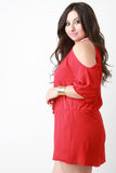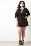 This trendy plus size romper features a textured woven fabric, tribal pattern trimmed v-neckline with self-tie tassel lace, cold shoulder, and elasticized sleeves. Finished with a back triple button hook closure and partial lining. Accessories sold separately. 100% Polyester.