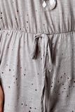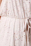 This stylish plus size jumpsuit features a distressed hole pattern design, mock neckline with nape button closure, sleeveless fit, and back opening. Finished with a cuffed hemline and self-tie waist drawstring. Accessories sold separately. Made in U.S.A. 100% Cotton.