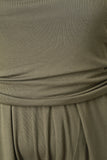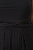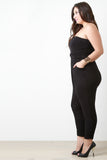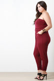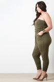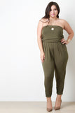 This plus size jumpsuit features a strapless, elasticized tube neckline, ruched side, elastic cinched waist, taper cut legs, and side pockets. Accessories sold separately. Made in U.S.A. 97% Rayon, 3% Spandex.
