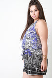 This stylish plus size romper features a lightweight woven fabric, graphic printed pattern, halter neckline, and sleeveless fit. Finished with an elasticized cinched waist with drawstring detail and self-tie drawstring closure at nape. Accessories sold separately. Made in U.S.A. 100% Polyester.