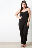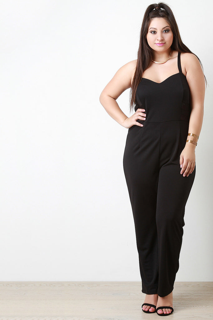 This chic plus size jumpsuit features a smooth stretchy knit fabric with, contrasting side mesh panels, flat shoulder straps, and relaxed fitting bottoms. Accessories sold separately. Made in U.S.A. Self: 96% Polyester, 4% Spandex. Contrast: 90% Nylon, 10% Spandex.