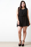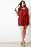 This plus size romper features a pleated round neckline, sleeveless design, buttons closure at one shoulder, and strappy draped construction back. Finished with an elastic waistband with drawstring tie and lined short bottom half. Accessories sold separately. 100% Polyester.