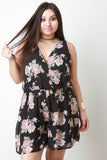 This plus size romper features a floral printed chiffon fabric, surplice v-neckline, sleeveless fit, and self-tie drawstring closure at nape. Partially lined. Accessories sold separately. Made in U.S.A. 100% Polyester.