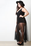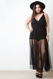 This plus size romper features a knit fabrication, lace and mesh contrast fabrics, deep v neckline, spaghetti straps, fitted shorts lining and a pleated mesh maxi skirt overlay. Accessories sold separately. Made in U.S.A.Self: 95% Polyester, 5% Spandex. Contrast: 100% Polyester.
