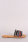 This tribal inspired flat sandal feature a soft toe loop, strappy construction with jewels/fray crochet detailing, lightly padded insole, and easy slide style.