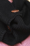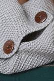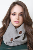 This scarf features a chunky knitted fabrication, wood button detail, and a closed end circle scarf design.