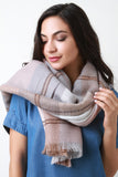 This scarf features a woven fabrication, frayed fringe edges, and plaid pattern. Can be worn as a shawl or over-sized scarf. 100% Acrylic.