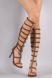 This gladiator heel, featuring elasticized sides and an adjustable back zipper. Designed with an ornament along the front. Finished on a stiletto heel.