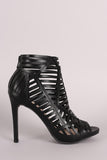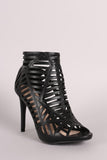 This peep toe heel features a geometric cutout design, stitching accents, and wrapped stiletto heel. Finished with lightly padded insole and back-zip closure.